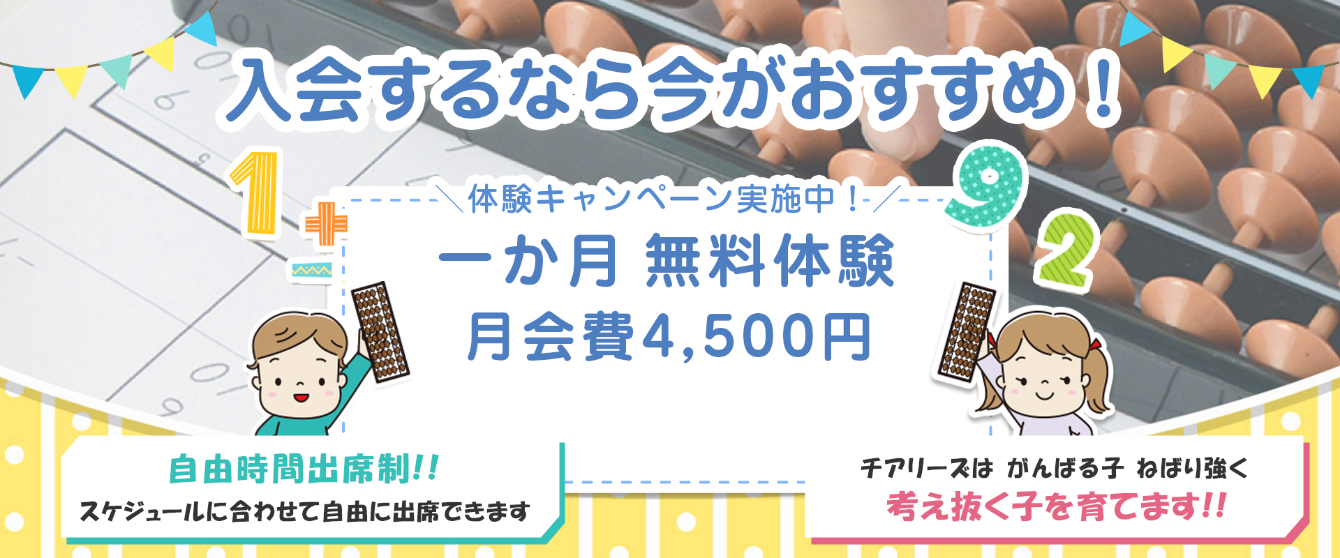 チアリ−ズでは、「親子そろばん」、「1ヶ月無料体験」、「兄弟割り引き」を実施して、よりお子様が学びやすい環境を提示致しております。